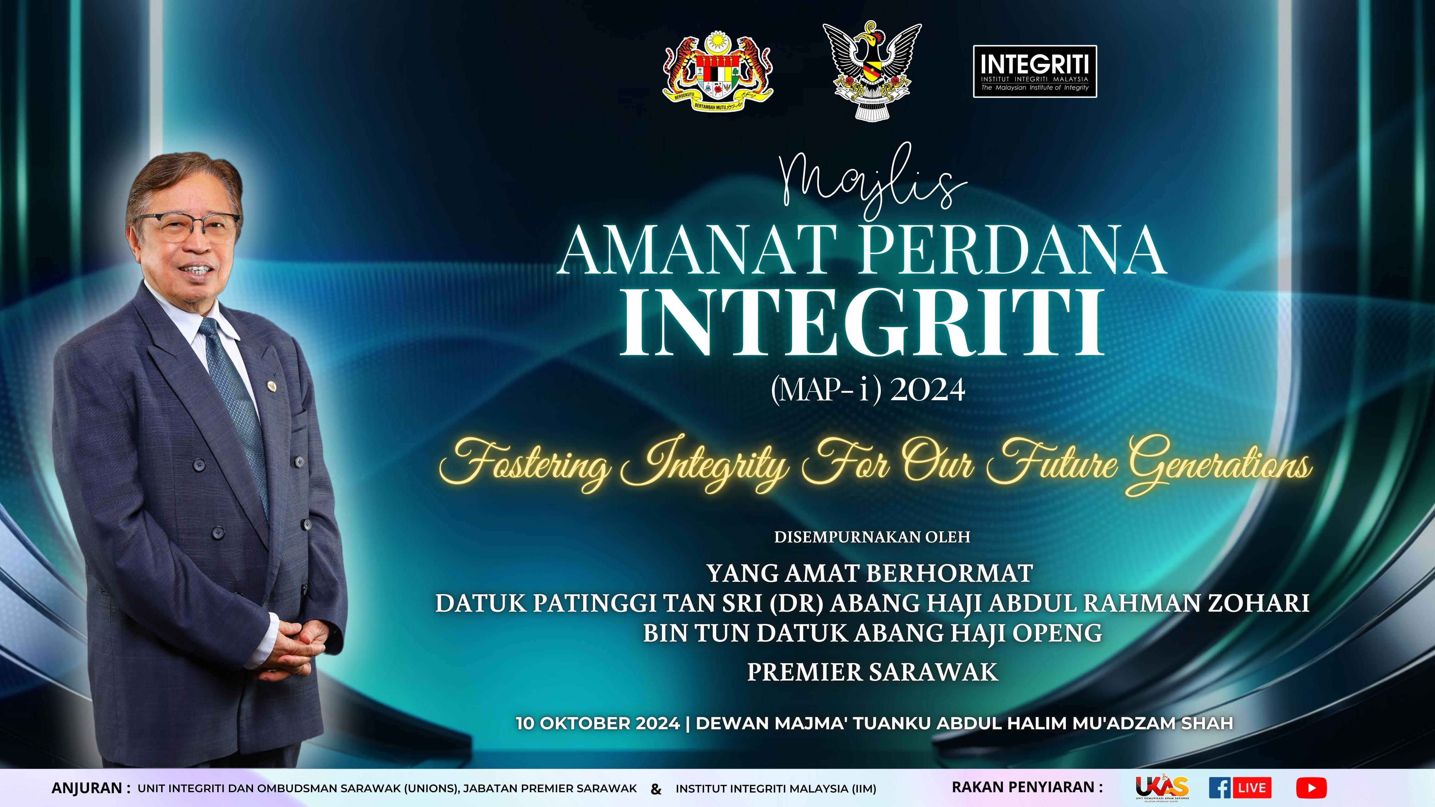 Unit Integriti dan Ombudsman Sarawak (UNIONS), Jabatan Premier Sarawak dengan kerjasama Institut Integriti Malaysia (IIM) akan menganjurkan Majlis Amanat Perdana Integriti (MAP-i) 2024 yang akan disempurnakan oleh YAB Premier Sarawak pada 10 Oktober 2024 (Khamis).