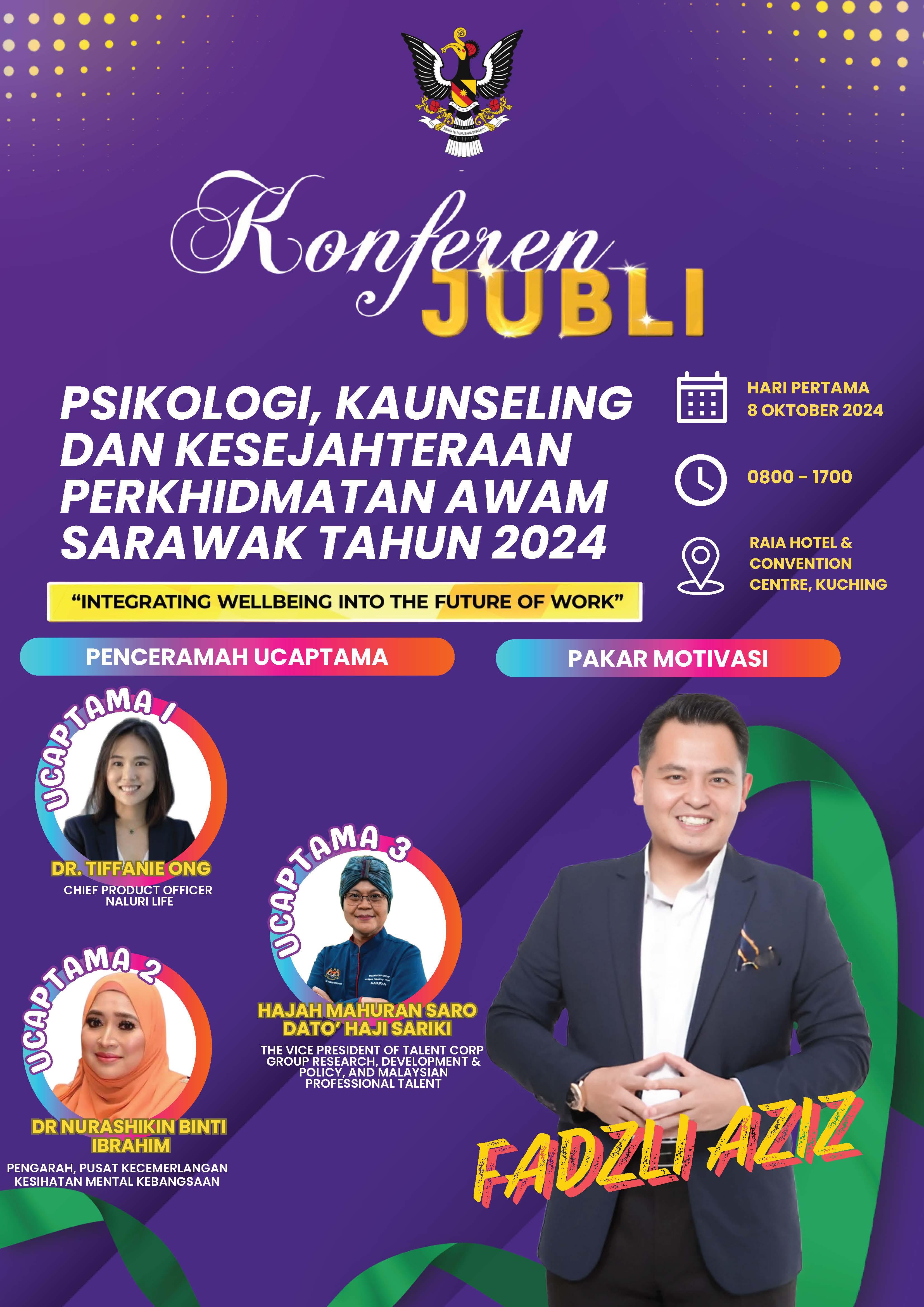Warga Perkhidmatan Awam Sarawak adalah dijemput untuk sama-sama menimba ilmu di Konferen Jubli Psikologi, Kaunseling dan Kesejahteraan Perkhidmatan Awam Sarawak Tahun 2024 anjuran Unit Pengurusan dan Pembangunan Sumber Manusia yang akan diadakan seperti ketetapan berikut :