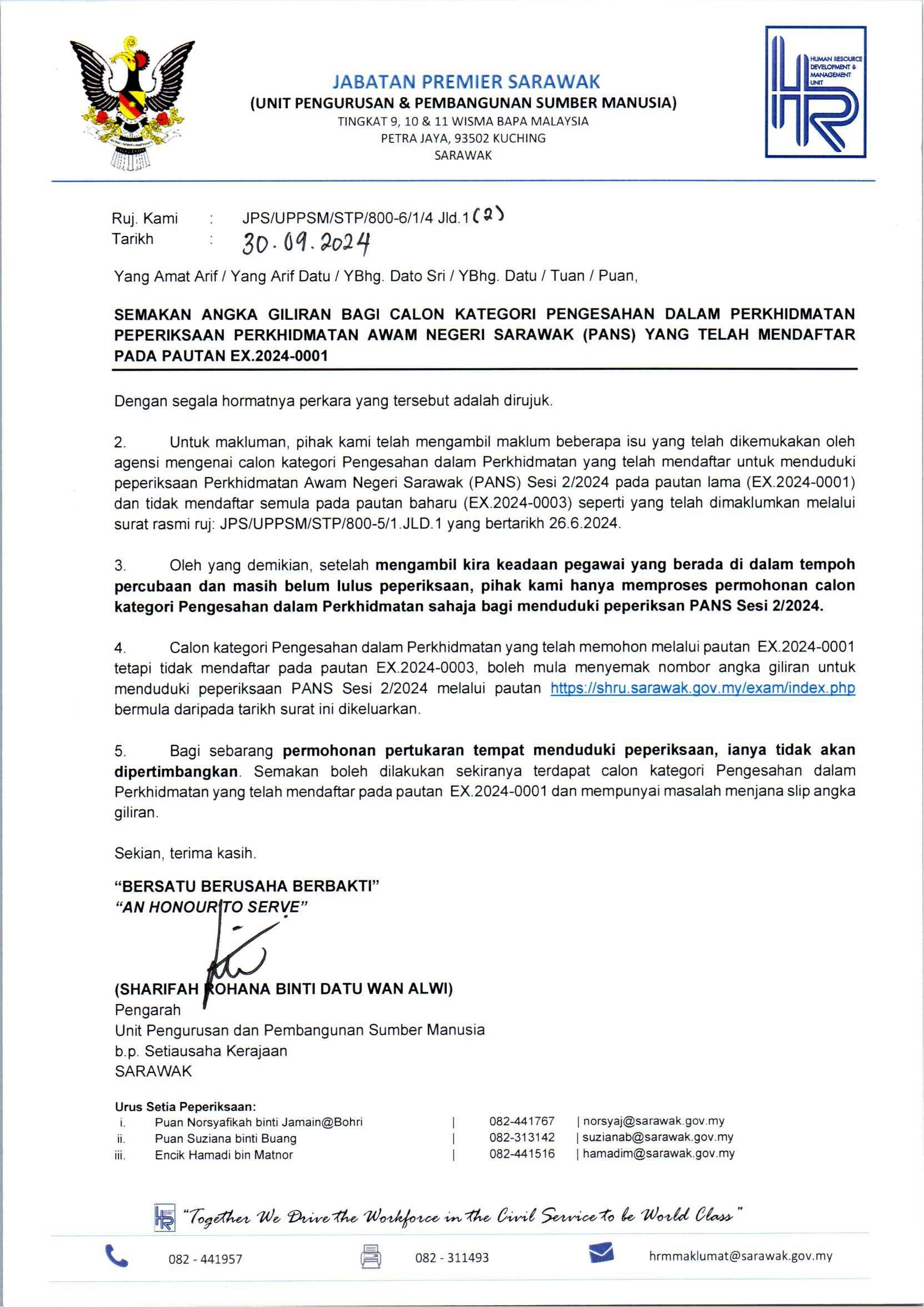 Untuk makluman, pihak kami telah mengambil maklum beberapa isu yang telah dikemukakan oleh agensi mengenai calon katehori Pengesahan Dalam Perkhidmatan yang telah mendaftar untuk menduduki peperiksaan Perkhidmatan Awam Negeri Sarawak (PANS) sesi 2/2024 pada pautan lama (EX.2024-0001) dab tidak mendaftar semula ke pautan baharu (EX.2024-0003) seperti yang telah dimaklumkan.