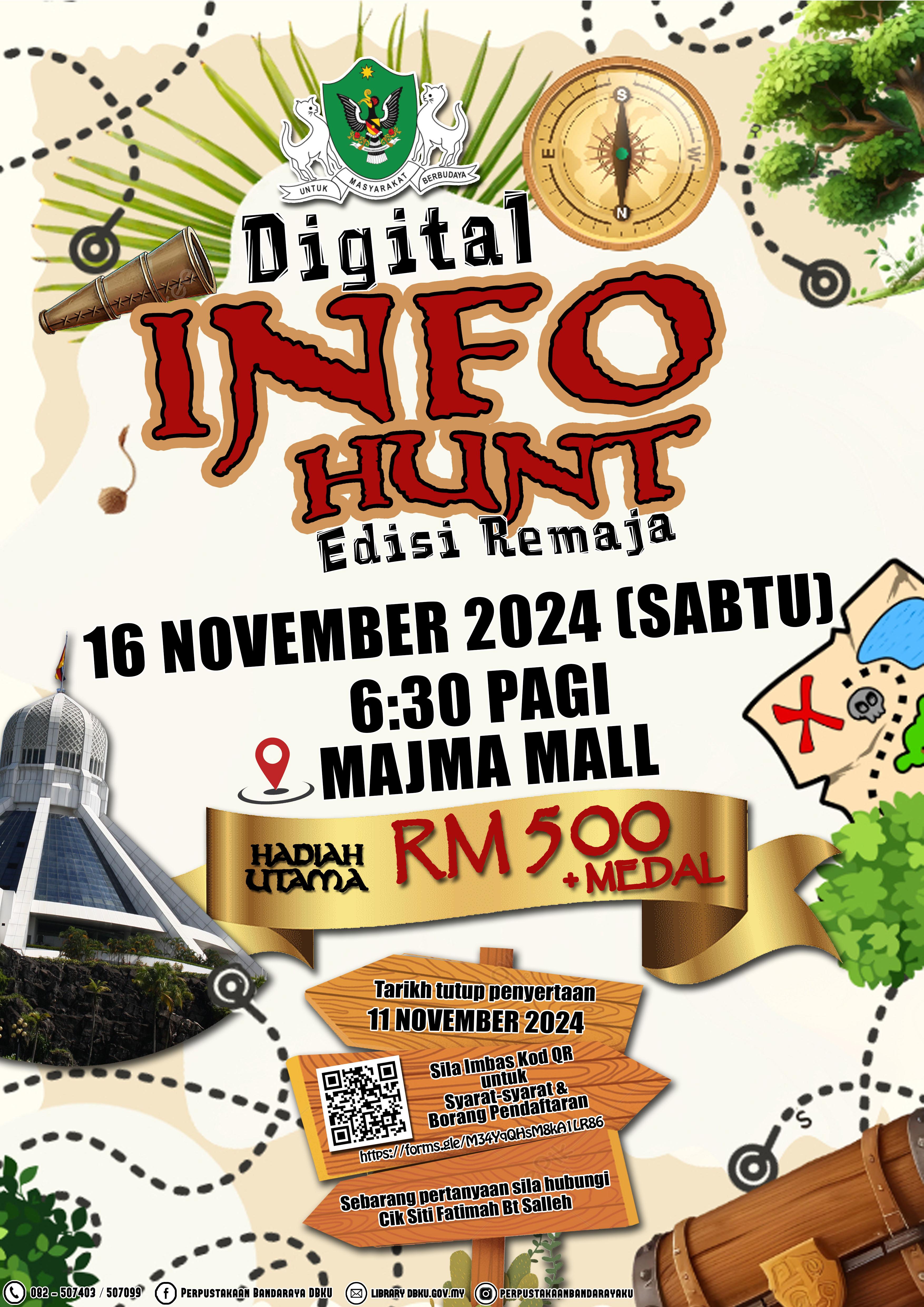 Perpustakaan Bandaraya DBKU akan mengadakan Pertandingan Digital Info Hunt Edisi Remaja. Pertandingan ini akan diadakan pada 16 November 2024 (Sabtu), jam 6.30 pagi di Majma Mall. Penyertaan terbuka kepada peserta berumur 15 hingga 18 tahun sahaja. Penyertaan adalah secara berkumpulan (3 orang dalam 1 kumpulan). Kepada yang berminat penyertaan adalah percuma sila imbas Kod QR yang disediakan atau klik link https://forms.gle/M34YqQHsM8kA1LR86 untuk syarat-syarat dan borang pendaftaran. Tarikh tutup penyertaan pada 11 November 2024 (Isnin).