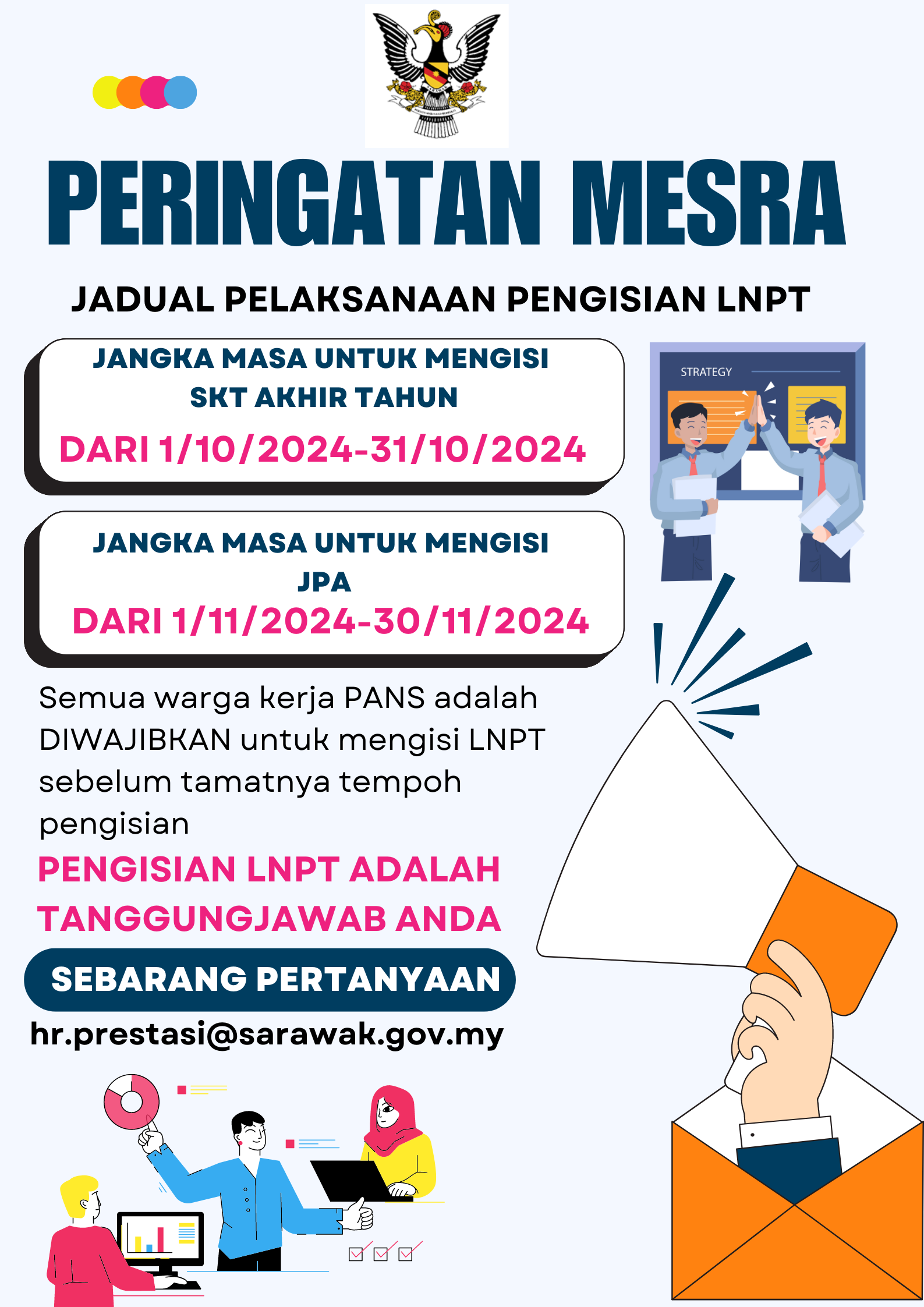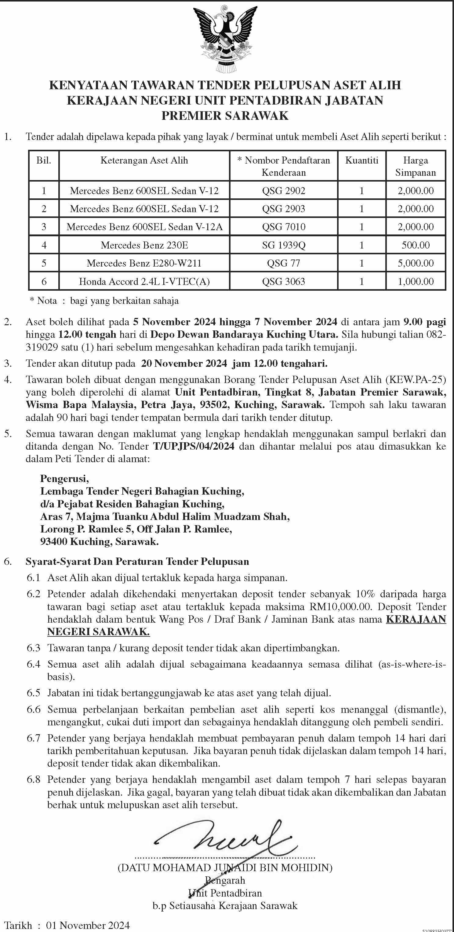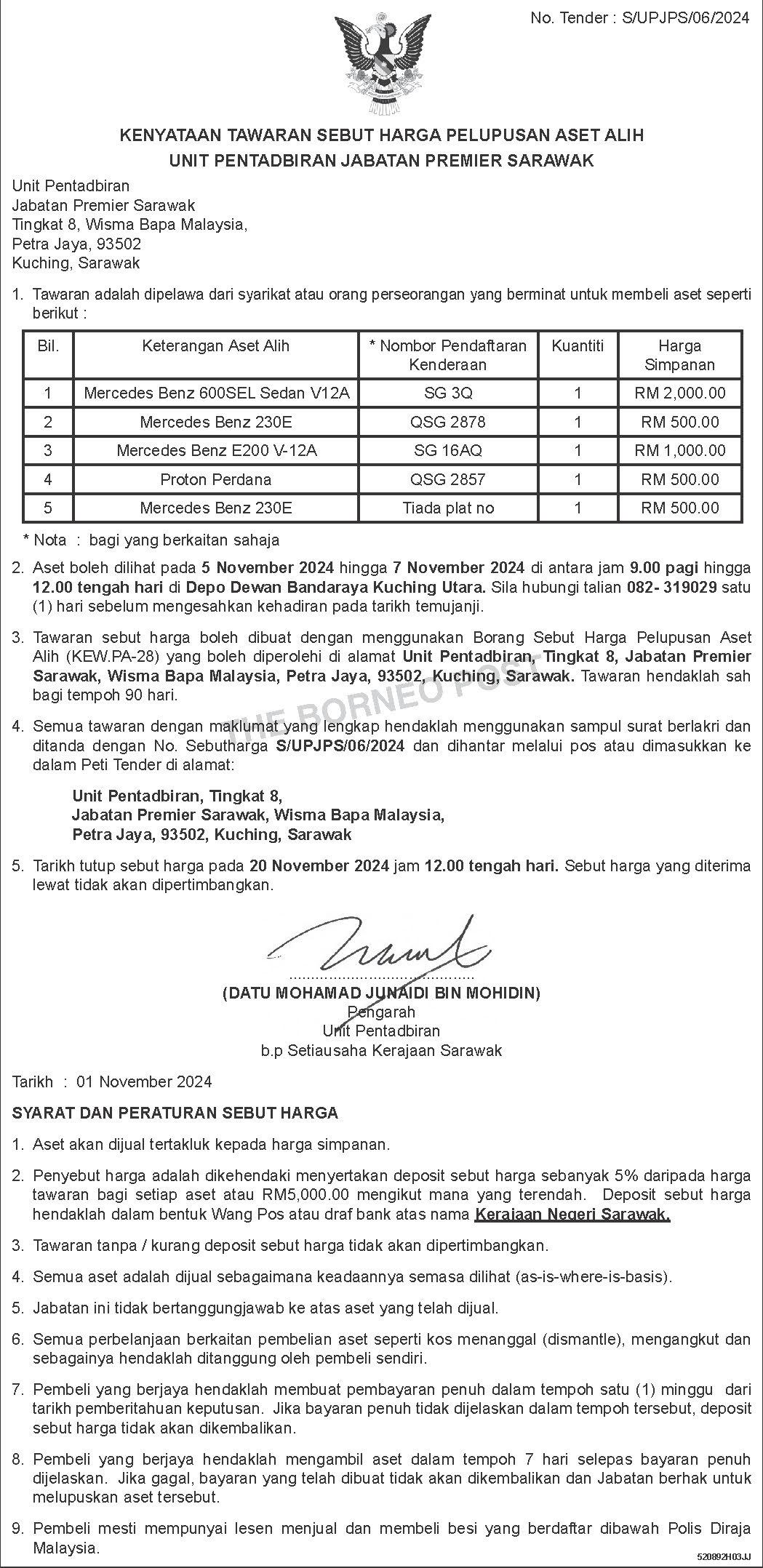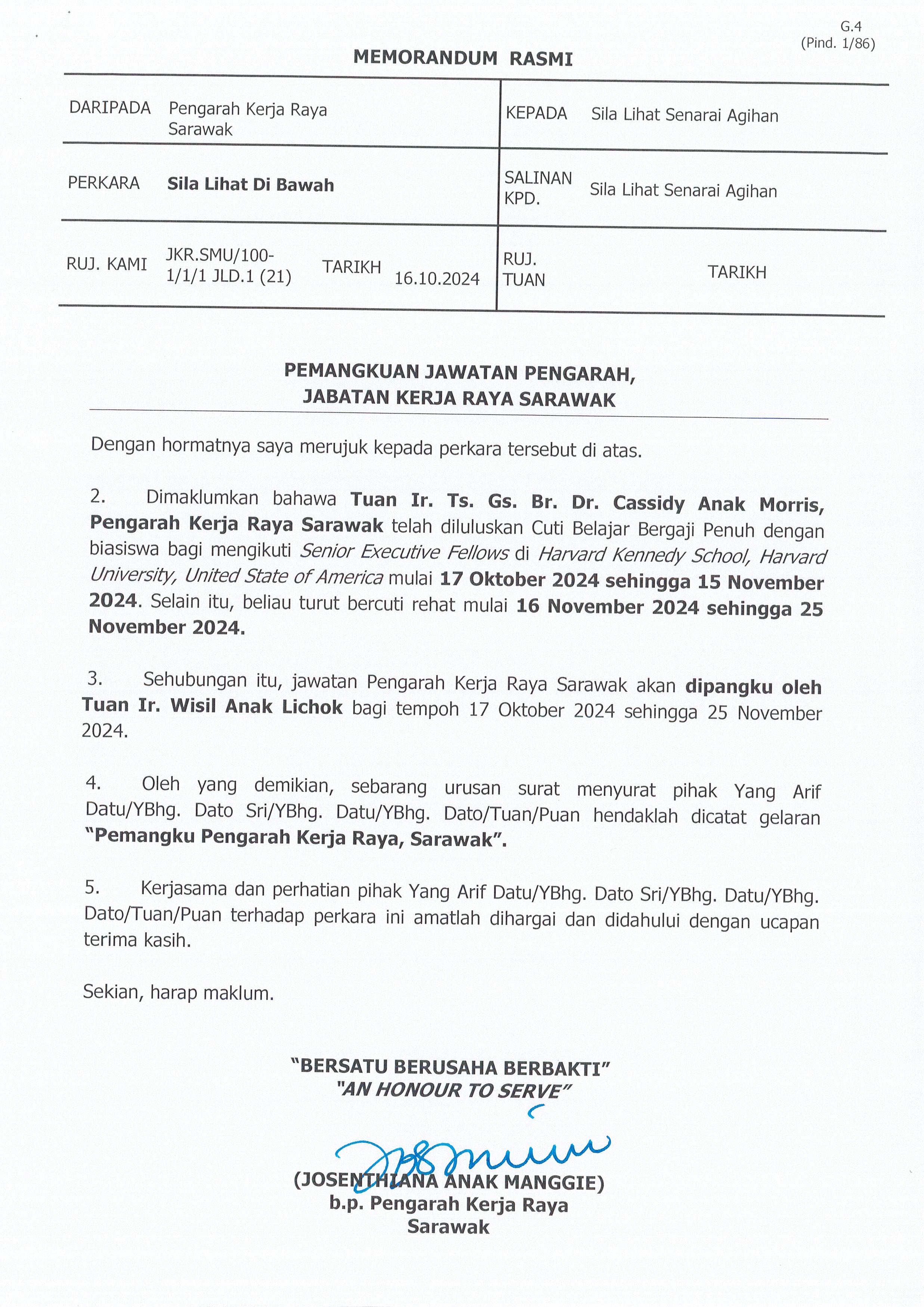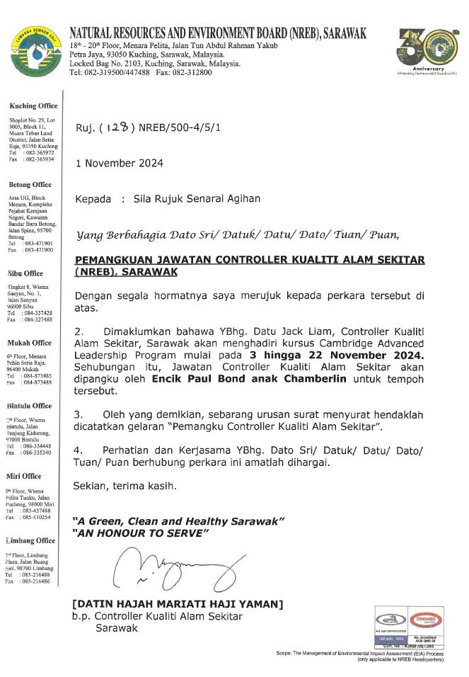 Dimaklumkan bahawa YBhg. Datu Jack anak Liam, Controller Kualiti Alam Sekitar Sarawak akan menghadiri kursus Cambridge Advanced Leadership Program mulai pada 3 hingga 22 November 2024. Sehubungan itu, jawatan Controller Kualiti Alam Sekitar Sarawak akan dipangku oleh Encik Paul Bond anak Chamberlin untuk tempoh tersebut.