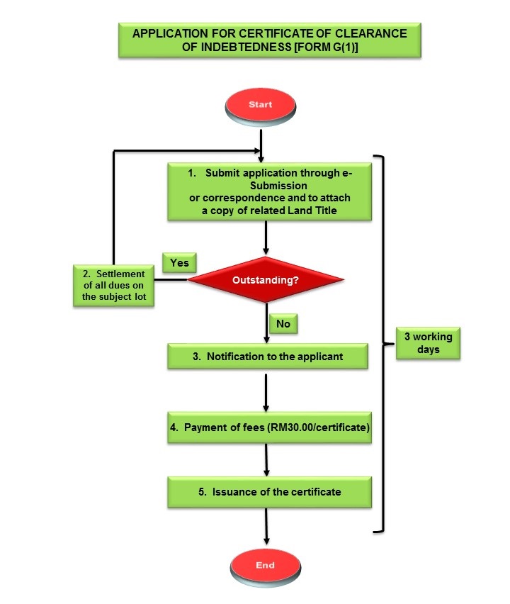 Form G(1) – “Certificate of Clearance of Indebtedness” as in the  Sarawak Land Code (Cap. 81 1958 Ed) is a certificate to certify that a property has no outstanding assessment rates before any transaction is made. This certificate is issued upon full settlement of outstanding rates and legal cost (if any).