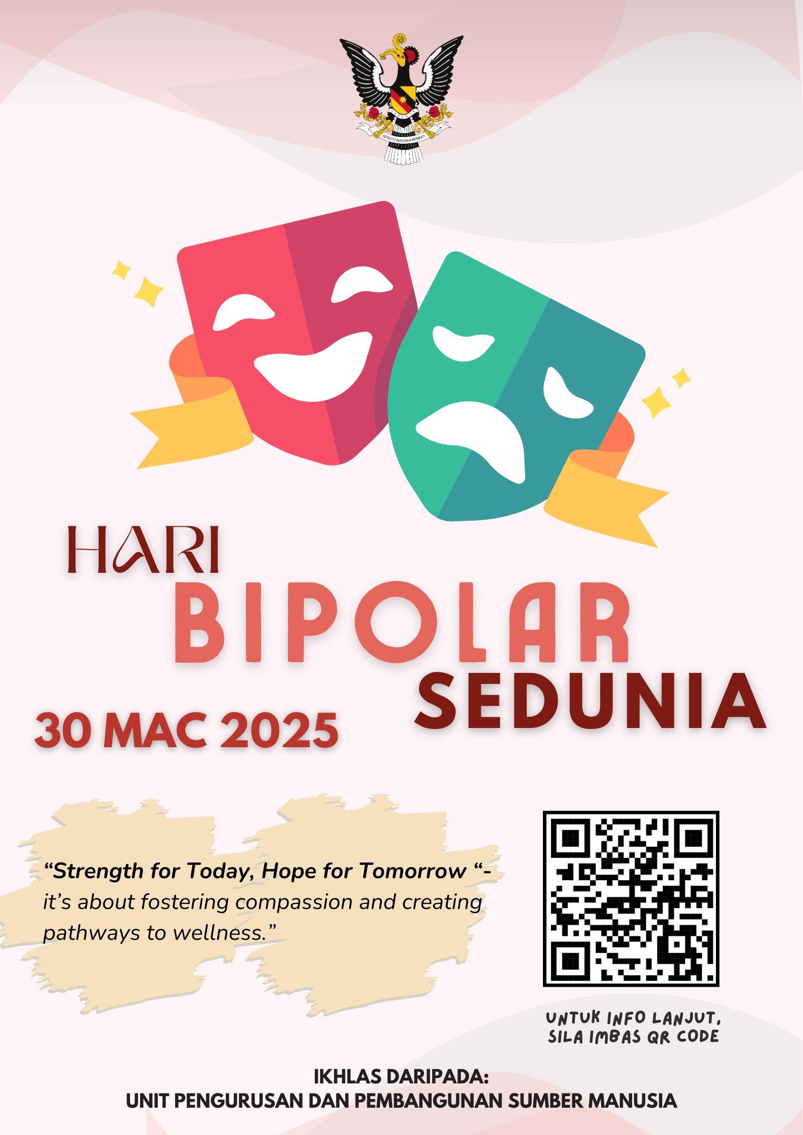 Gangguan bipolar adalah salah satu punca utama ketidakupayaan di seluruh dunia kerana ia boleh menjejaskan banyak bidang kehidupan. Orang yang mengalami gangguan bipolar mungkin mengalami hubungan yang tegang, masalah di sekolah atau tempat kerja, dan kesukaran dalam menjalankan aktiviti harian. Mengalami gangguan bipolar juga meningkatkan risiko bunuh diri dan mengalami kebimbangan dan gangguan penggunaan bahan. Untuk mengetahui lebih lanjut mengenai gangguan bipolar, boleh imbas pada QR di poster.