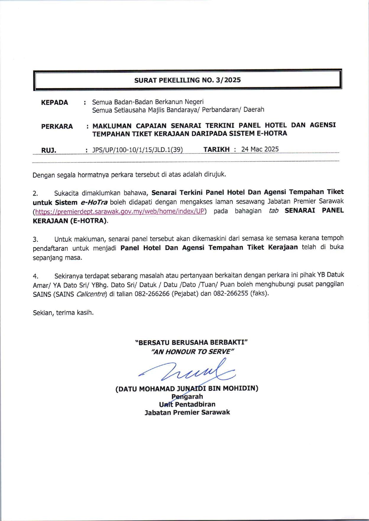 Sukacita dimaklumkan bahawa, Senarai Terkini Panel Hotel Dan Agensi Tempahan Tiket untuk Sistem e-HoTra boleh didapati dengan mengakses laman sesawang Jabatan Premier Sarawak (https://premierdept.sarawak.gov.my/web/home/index/UP ) pada bahagian tab SENARAI PANEL KERAJAAN (E-HOTRA).