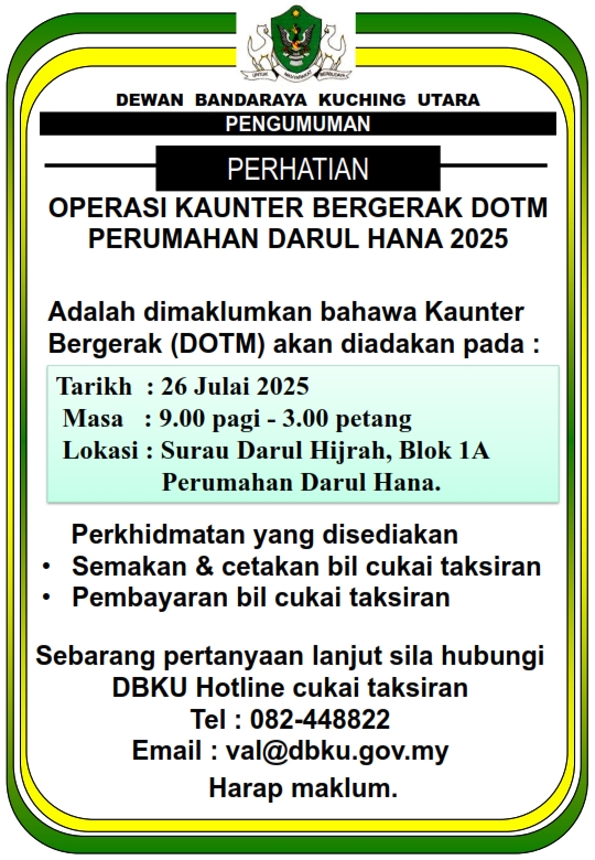 Mobile Counter (DBKU On The Move (DOTM) scheduled 4 days a week at identified locations such as Housing areas, villages, government offices and shopping area collects Kuching North City Hall’s assessment rates and other agencies utility bills.
